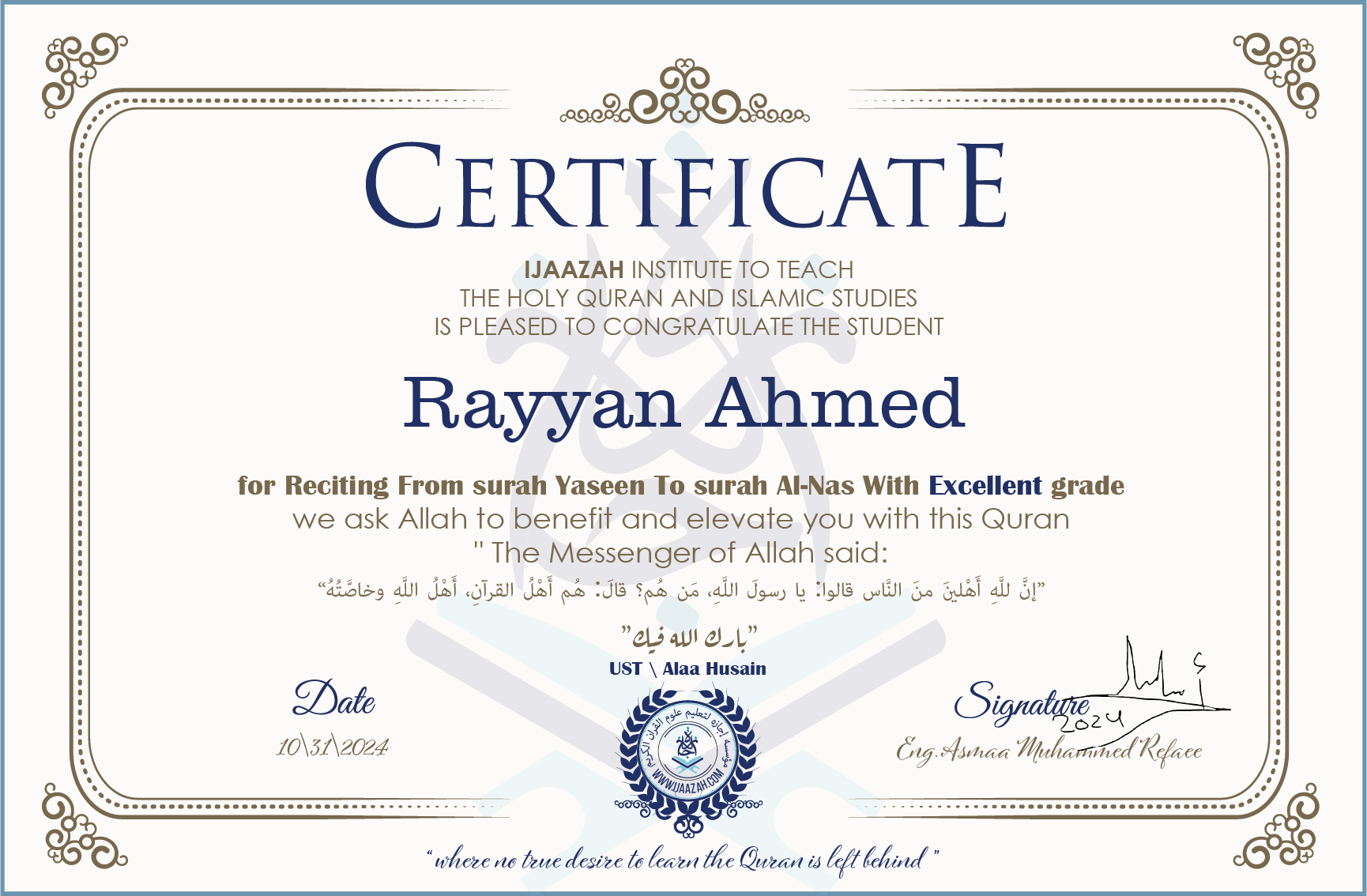 Rayyan Ahmed for Reciting From Surah Yaseen To Surah Al-Nas
