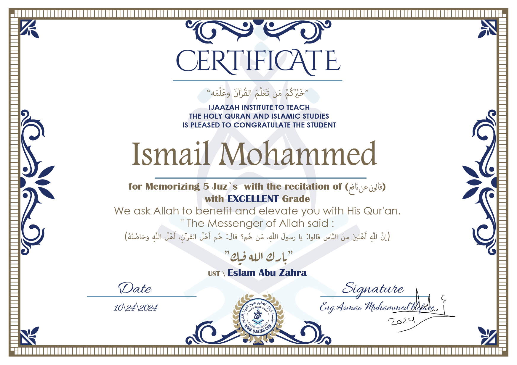 Ismail Mohammed for Memorizing 5 Juz\’s with the recitation of (قالون عن نافع)