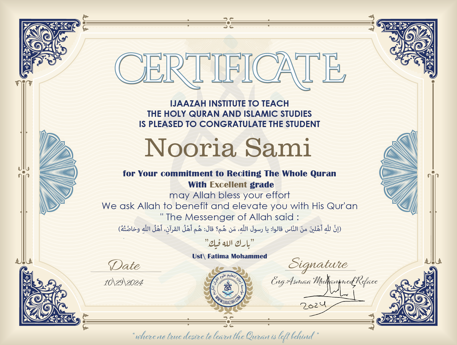 Nooria Sami for Your commitment to Reciting the Whole Quran