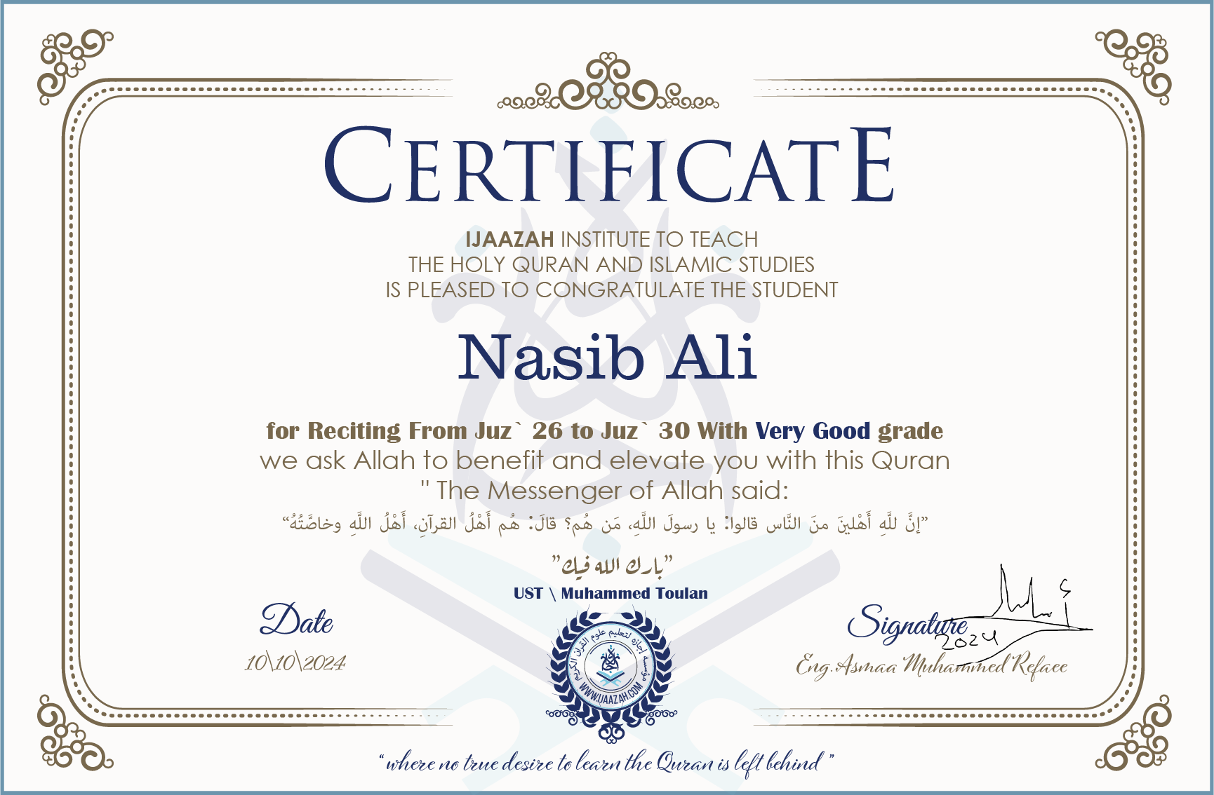 Nasib Ali for Reciting From Juz\’ 26 To Juz\’ 30