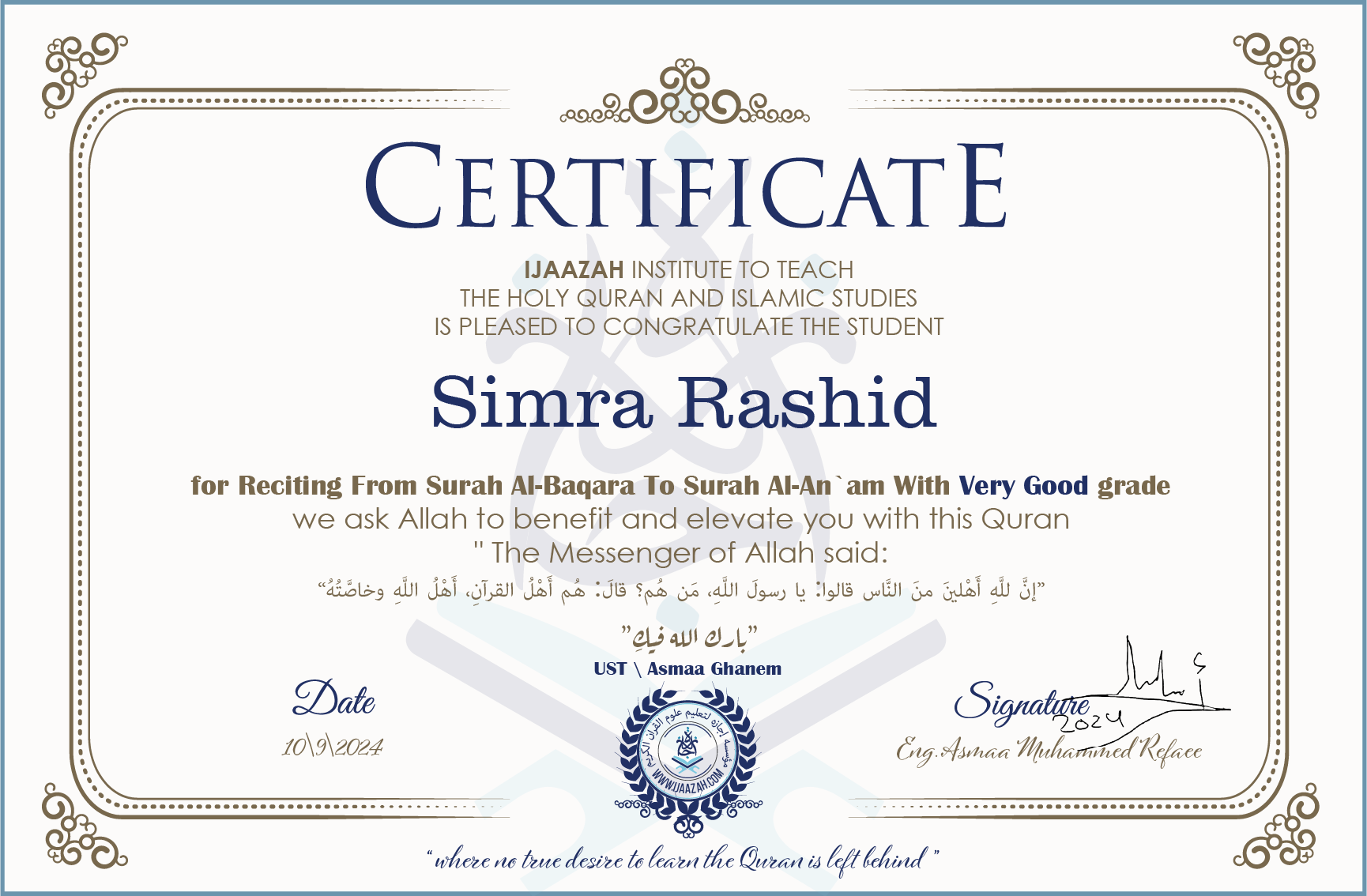 Simra Rashid for Reciting From Surat Al-Baqara To Al-An\’am