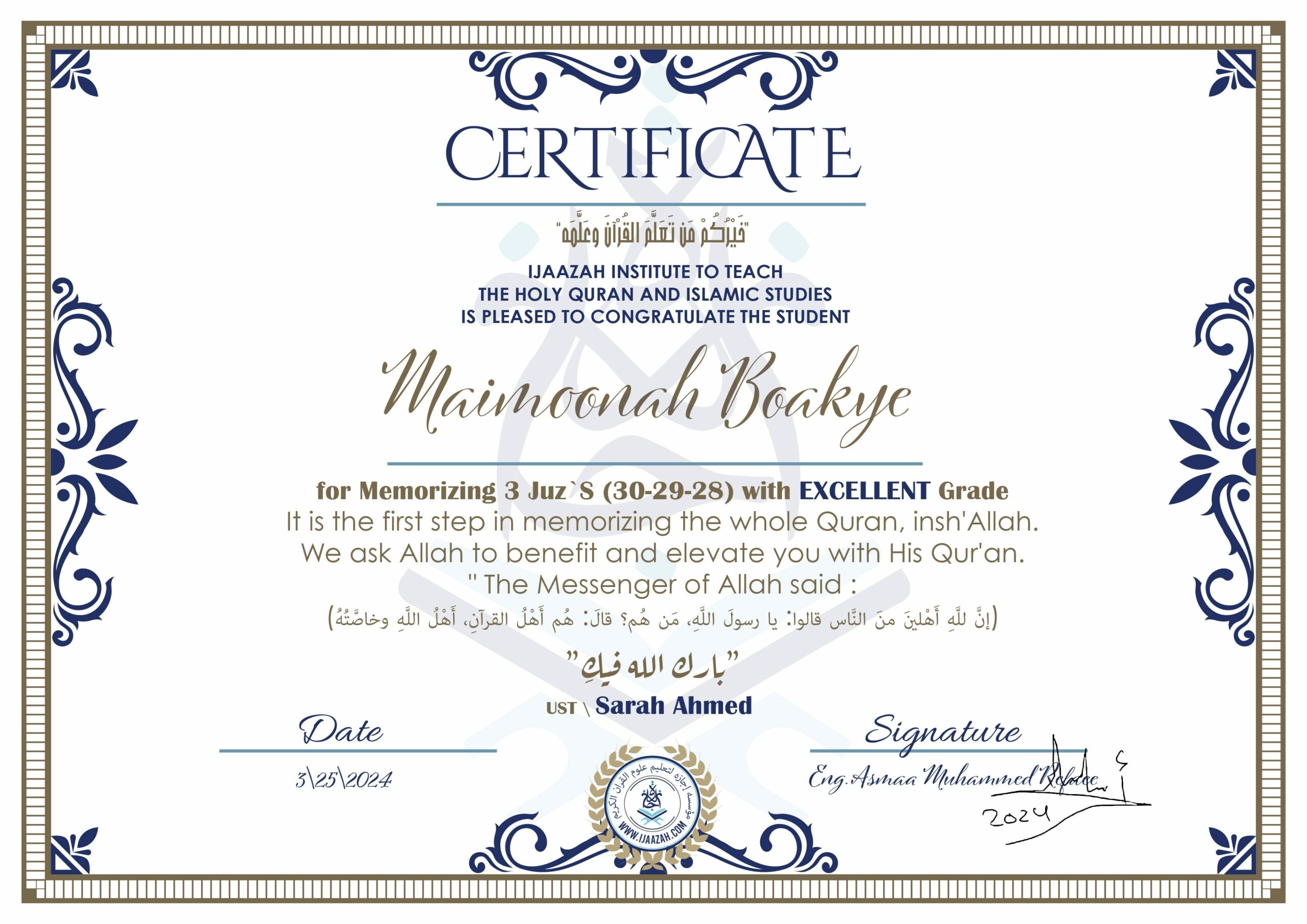 Maimoonah Boakye for Memorizing 3 Juz\’s (30-29-28)