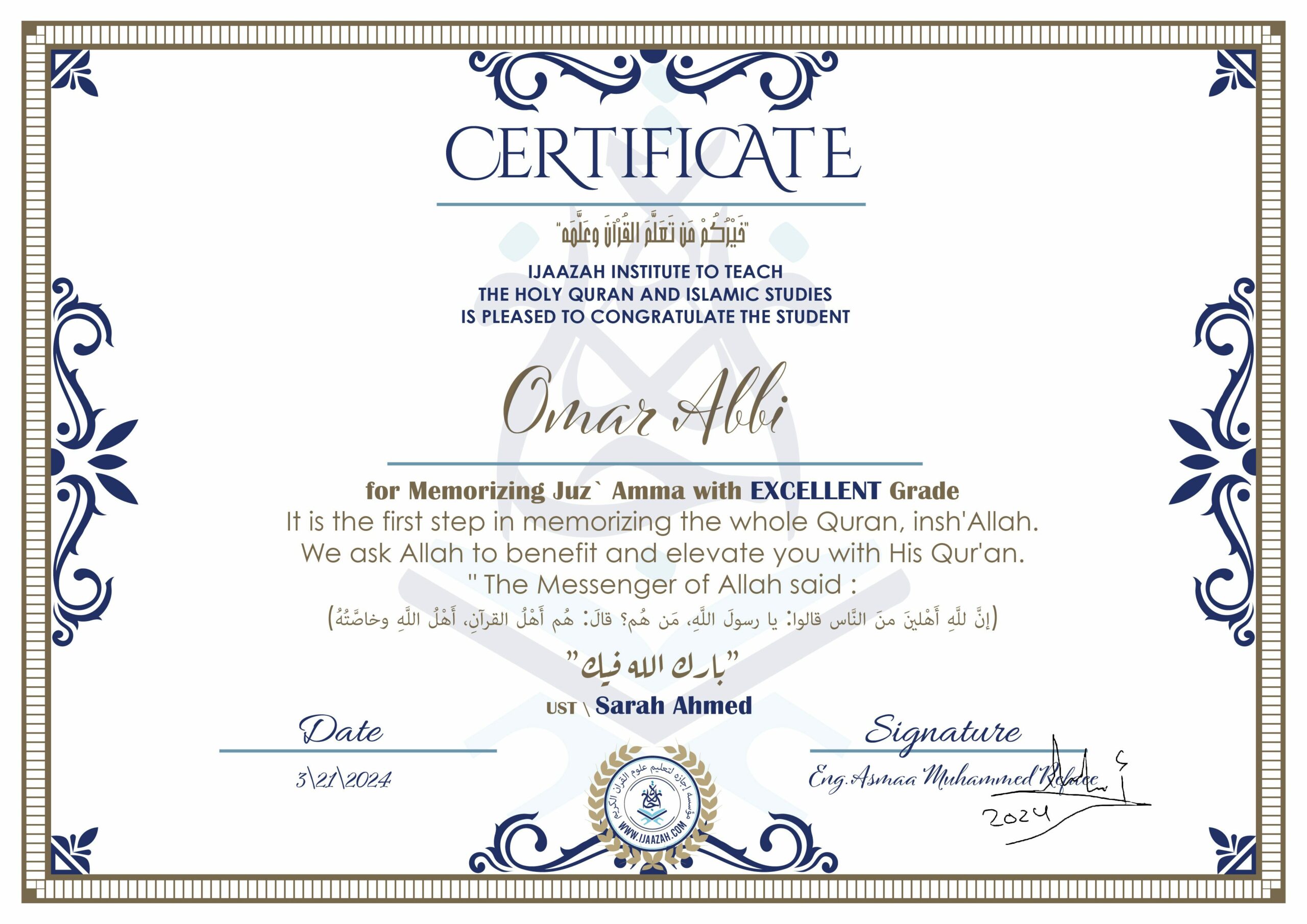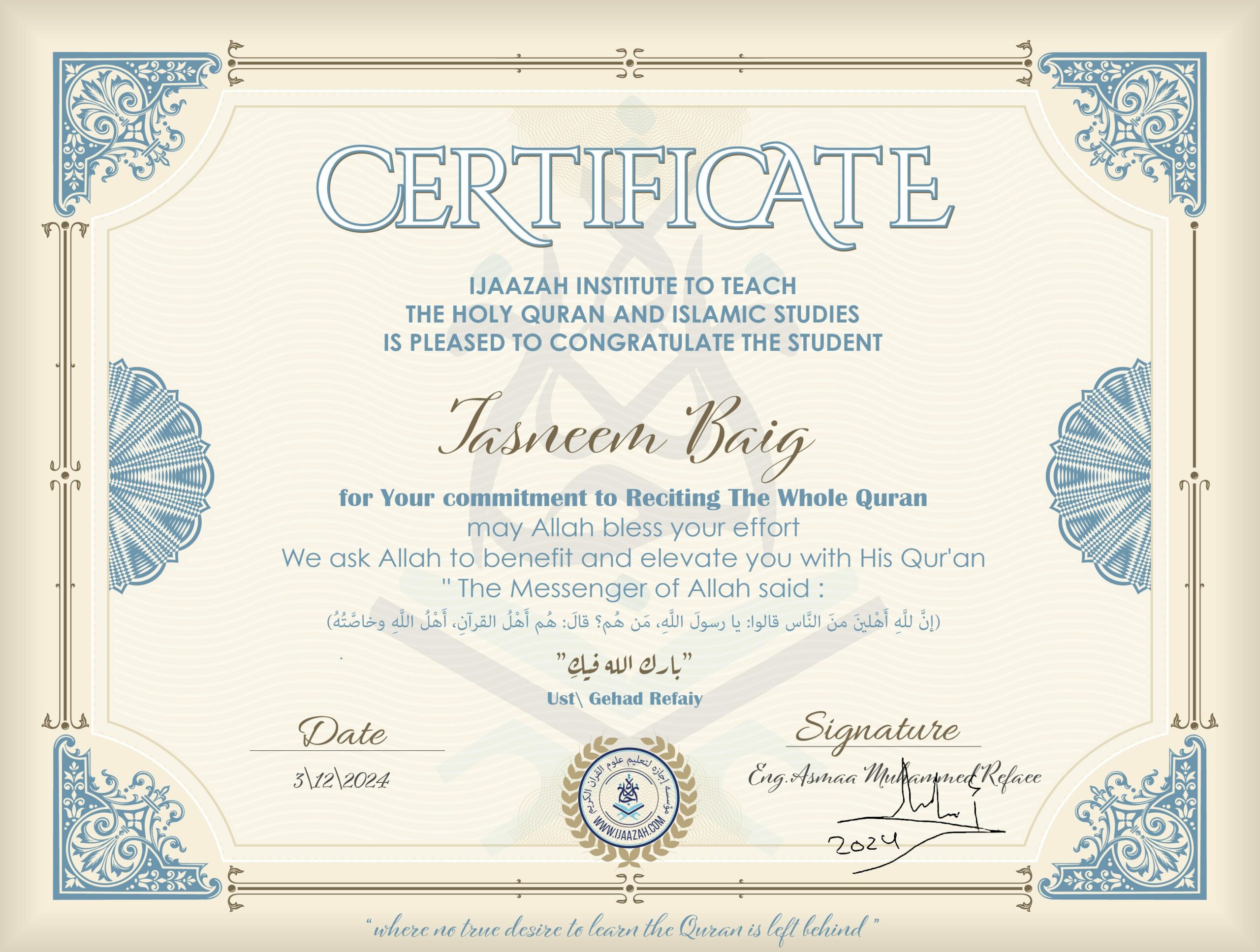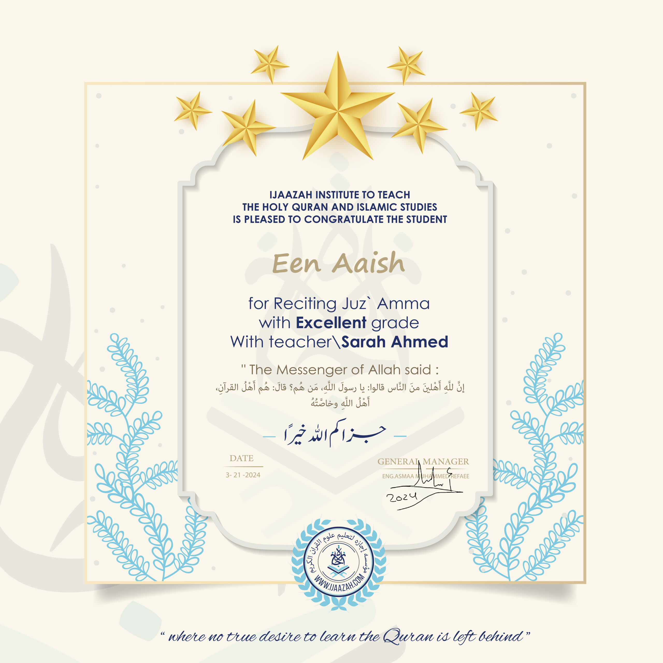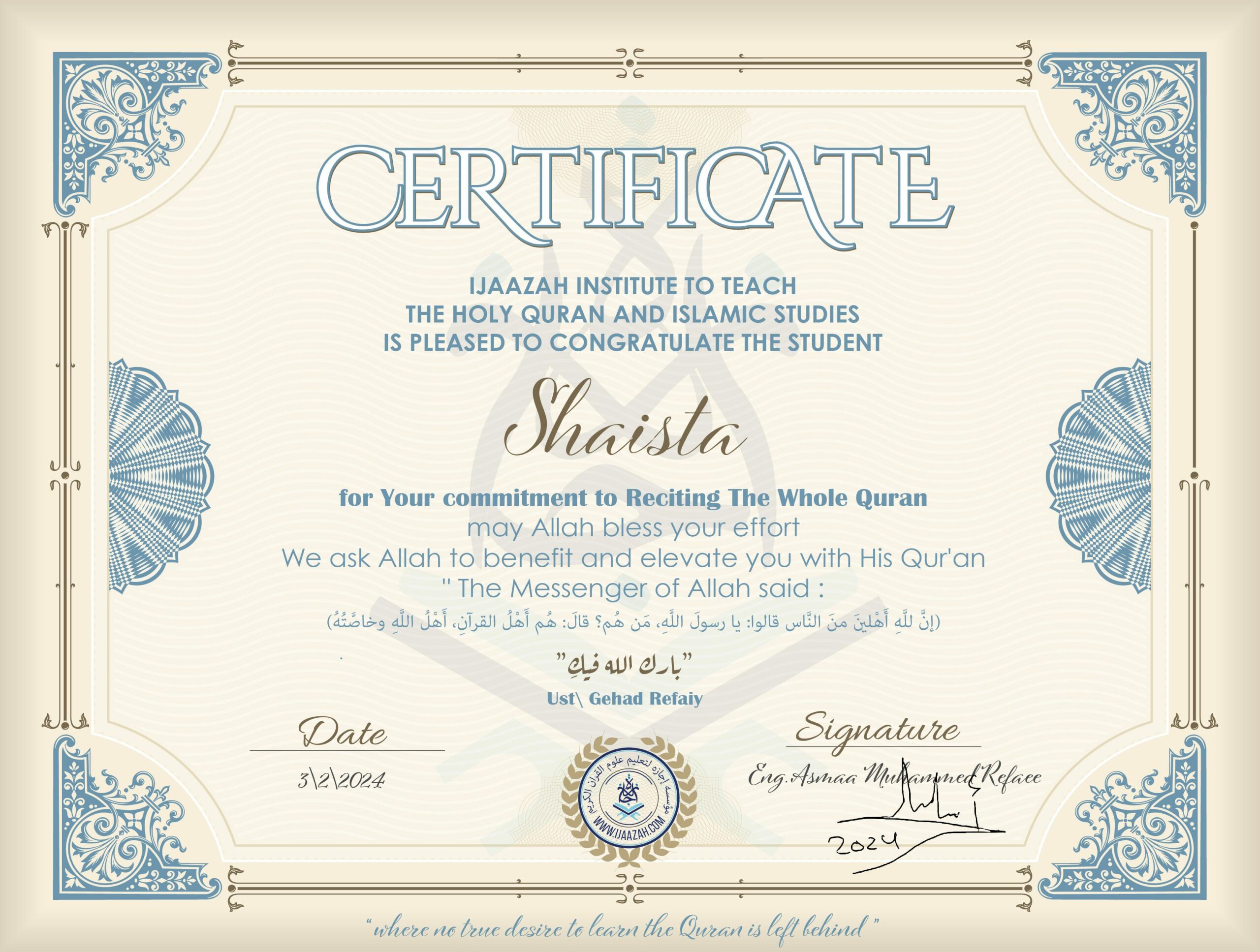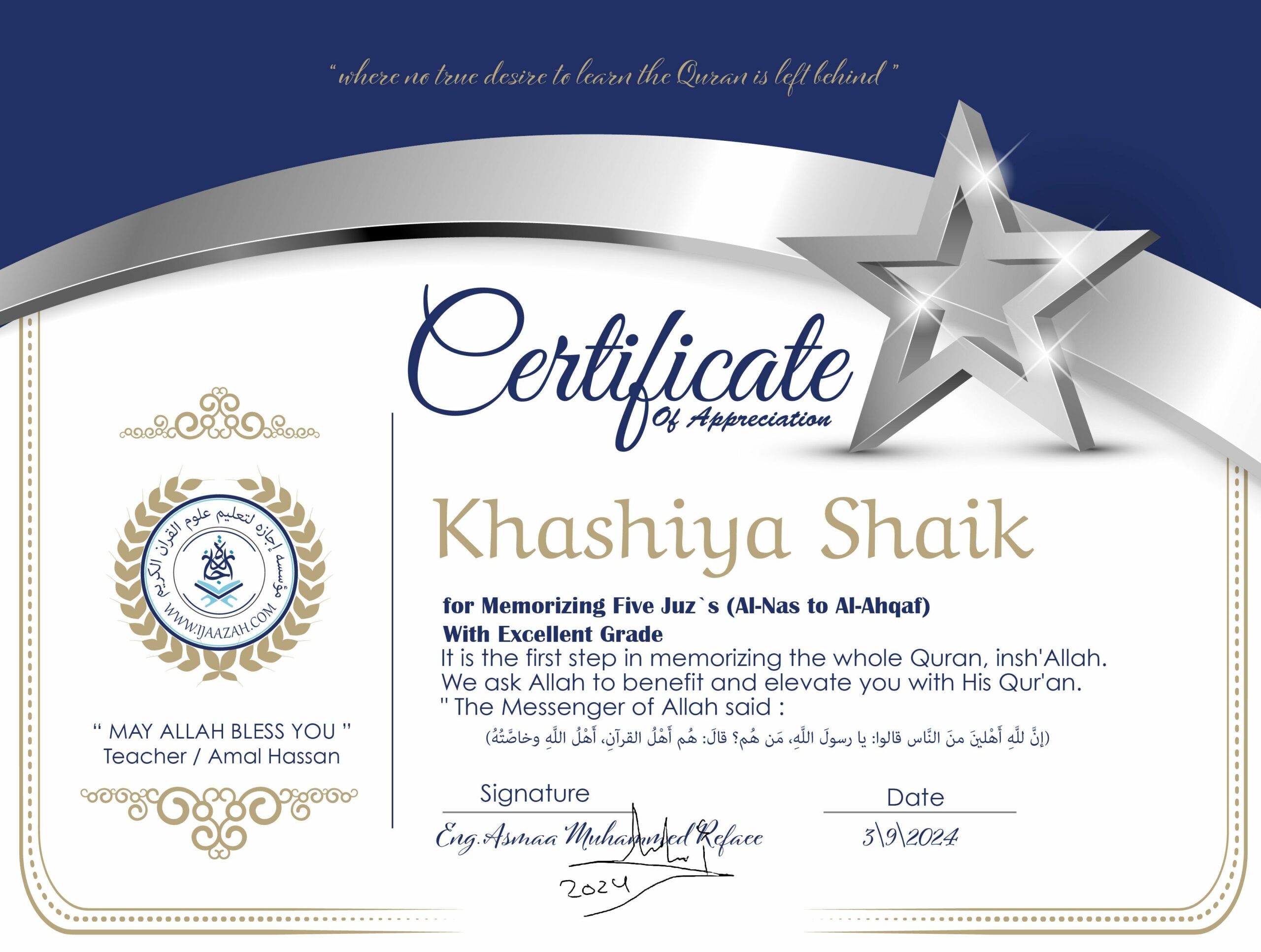 Khashiya Shaik for Memorizing Five Juz`s (Al-Nas to Al-Ahqaf)